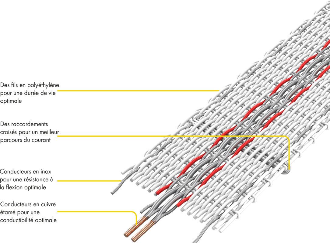 Blanc-rouge, avec 2 conducteurs en cuivre, diam. 0,30 mm et 5 conducteurs en inox, diam. 0,20 mm.